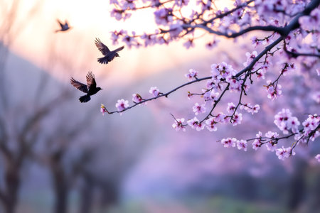 Birds flying near a cherry tree branch full of pink flowers at sunset in springtime