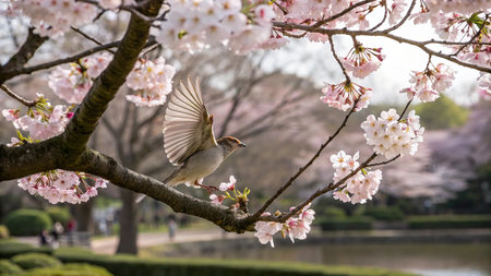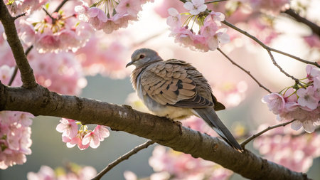 A small bird rests gently on a blossoming cherry tree branch, surrounded by soft petals in a serene spring setting, evoking feelings of calm and beauty.