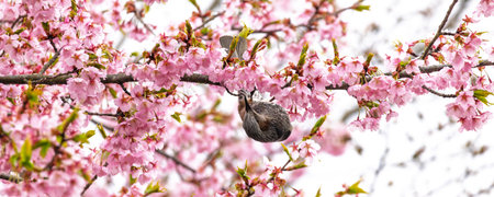 Panorama with Brown eared bulbul (Hypsipetes amaurotis) hanging on branch lokking for food in sakura flowers in Kyoto in Japan