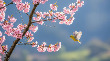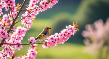 A charming bird perches on a branch adorned with delicate blossoms, creating a serene and vibrant atmosphere. Perfect for nature and spring-themed projects.