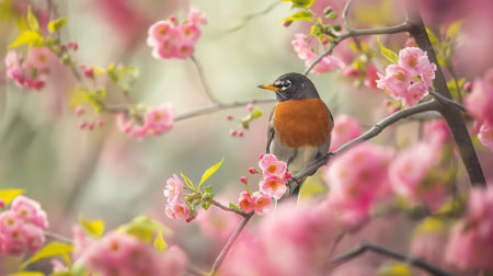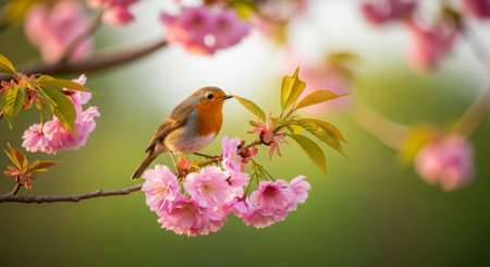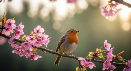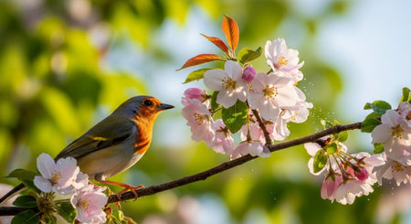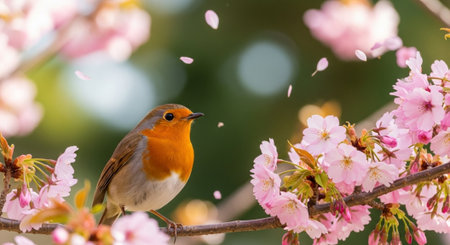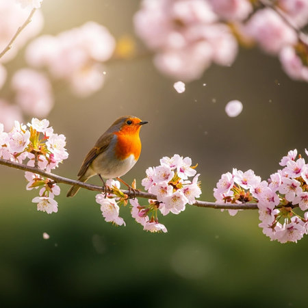 Vibrant Robin Perched on Blossoming Branch in Springtime Light