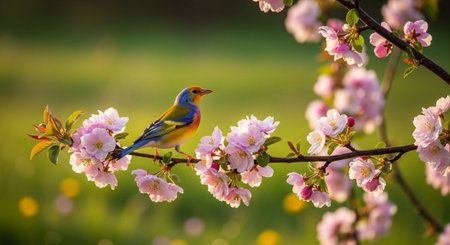 Vibrant painted bunting perched on cherry blossom branch in spring