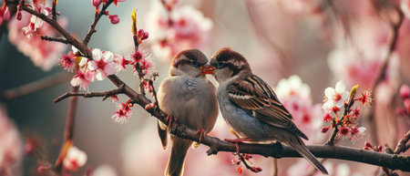 A charming scene of two birds nestled together on a branch adorned with vibrant cherry blossoms, embodying the essence of spring and love in nature.