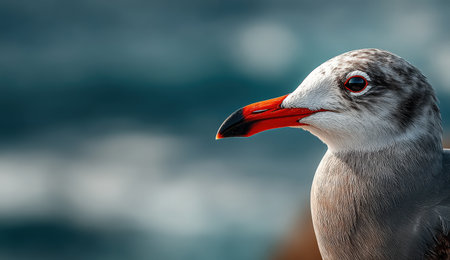 Detailed close-up of a seagull with vibrant red beak and focused gaze, set against a soft ocean backdrop, highlighting the essence of avian life and natural beauty