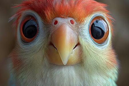Close view of an exotic bird showcasing vibrant red, orange, and white feathers with large, expressive eyes. the detailed shot highlights the intricate plumage and curious expression, perfect for wildlife-themed designs or educational materials. Generative AI