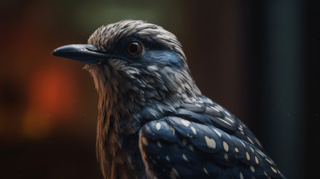 a solitary bird basks in the warm sunlight, surrounded by a captivating blend of dark gold and orange hues. the image showcases a soft focus romanticism, highlighting the bird's exaggerated facial features. through the technique of focus stacking, the dark navy and light brown tones create an intense close-up, evoking a dreamy symbolism. ai generated