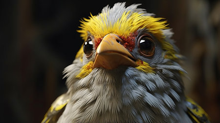 a lifelike 3d character of a finch with comical bulging eyes is depicted in this hyper-realistic sci-fi style photo. the intense emotion and subtle expressions, inspired by the barbizon school, bring the character to life. the use of felt creations and overexposure adds texture and depth to the image. ai generated