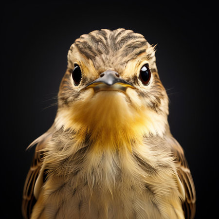 the american pipit showcases its striking facial features in this mesmerizing close-up portrait, expertly captured through the lens of a skilled wildlife photographer, highlighting the bird's intricate plumage and expressive eyes in a vibrant, surreal fashion that blurs the lines between reality and art. ai generated
