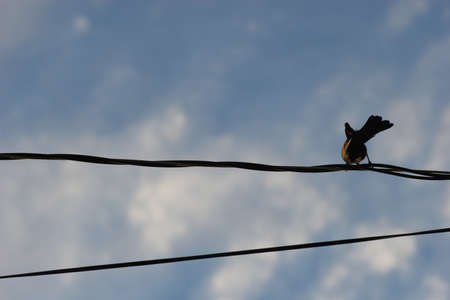 one black bird to hold at power line on blue sky background. indian myna. dark tone process