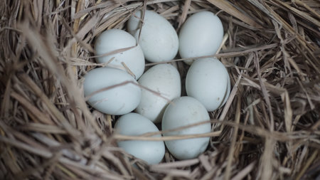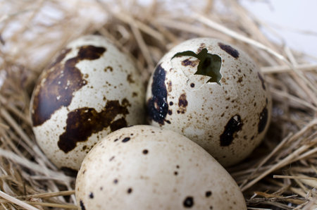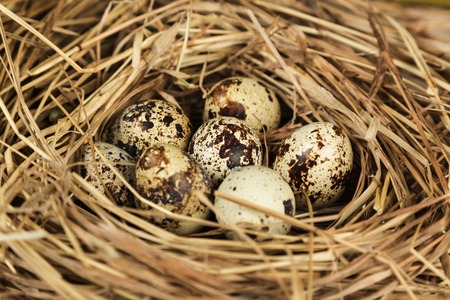 Conceptual still-life with quail eggs in hay nest, close up, selective focus