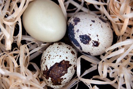 Conceptual still-life with quail and hen eggs in nest over dark background