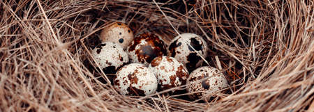 Fresh quail brown eggs with nest, rustic background with eggs with natural light and empty space for text, selective focus, Banner photo. Wild eggs in the nest