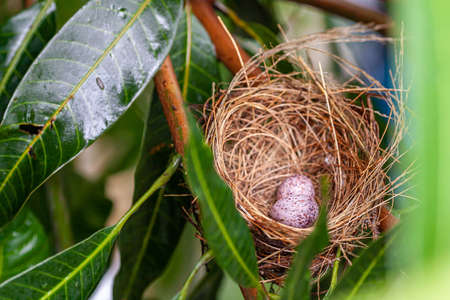 retinue of grass and small twigs of the tree nest tiny birds and eggs in it