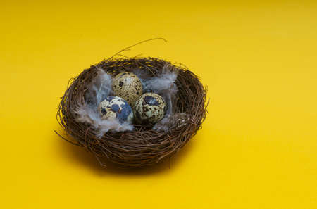Nest of twigs with quail eggs closeup, copy space