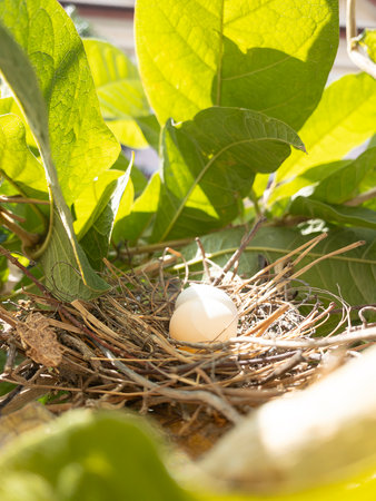 A single teal egg rests in a bird's nest nestled amongst vibrant green leaves. The scene evokes a sense of calm and new beginnings.