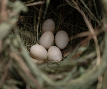 Group of five bird eggs in a blackbird dry grass nest.