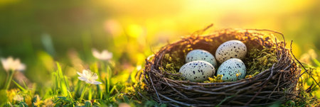 A close-up of speckled quail eggs nestled in a bird's nest, bathed in the warm light of a sunrise. A beautiful scene of springtime nature.