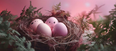 Four pastel pink Easter eggs nestled in a cozy bird's nest.