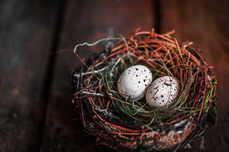 Fresh quail brown eggs with nest, rustic background with eggs with natural light and empty space for text, selective focus, Banner photo. Wild eggs in the nest
