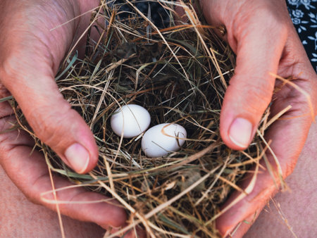 A woman holds a small birds nest containing two white eggs. The moment captures the serene connection between nature and nurturing.