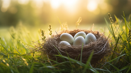 A delicate bird's nest cradles a clutch of fresh eggs, bathed in the warm, golden glow of early morning light.