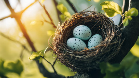 Birds nest with speckled eggs in a tree, sunlight and leaves. Nature and wildlife concept