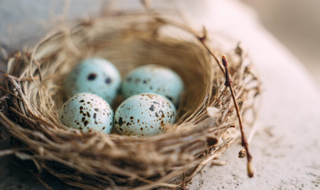Four vibrant blue speckled eggs rest in a rustic bird nest against a blurred natural background. the scene symbolizes new beginnings, spring, and wildlife, with intricate nest textures nature's artistry. Generative AI