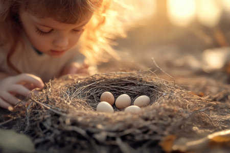A young child curiously examines a bird nest containing five eggs while surrounded by a peaceful natural landscape.