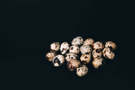 Quail eggs on a dark black background. Bird spotted eggs in a real nest. Several objects. Healthy food