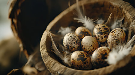 A beautiful arrangement of spotted eggs nestled in a rustic wooden bowl, adorned with delicate feathers, perfect for creating an enchanting spring ambiance.