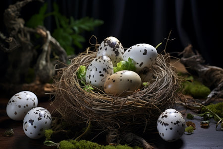 Conceptual still-life with quail and hen eggs in nest over dark background