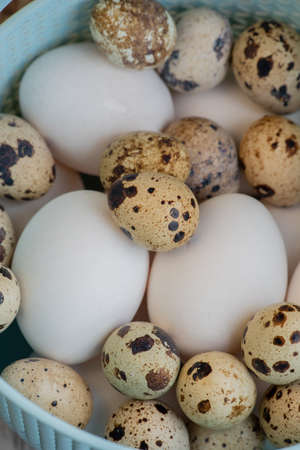 Lots of white chicken eggs and quail eggs in a plastic basket. selective focus