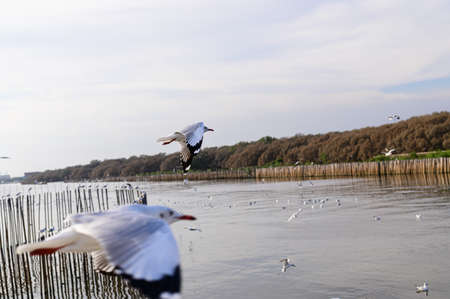 The background of seagulls over the sky at Bangpu Recreation Center, the Gulf of Thailand