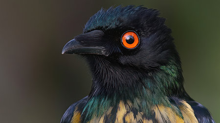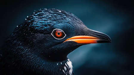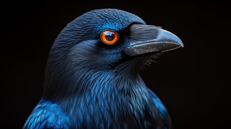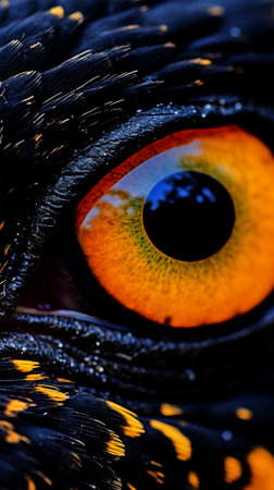 Close-up image of bird with bright orange eye and dark feathers Intricate feather details visible