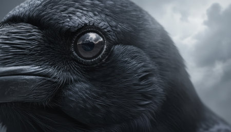 An extreme close-up captures the intricate detail of a raven's dark eye, reflecting a dramatic cloudy sky, highlighting its glossy feathers and sharp beak