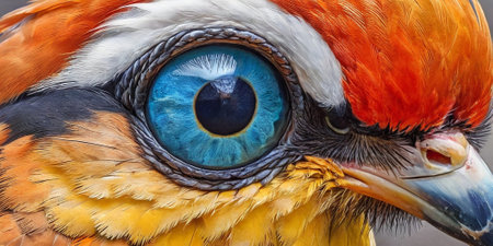 Close-up of a vibrant birds eye and detailed surrounding feathers