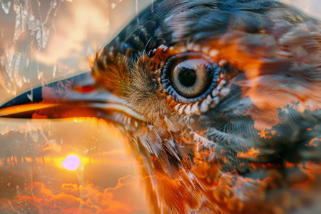 This captivating composition features a bird's head prominently, with intricate feather details and a mesmerizing gaze, set against a stunning sunset filled with rich colors and cloud patterns.