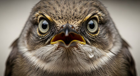 An extreme, high-detail macro portrait of a bird's face, possibly a fledgling, looking directly at the camera with wide, intense eyes. A tiny drop of water hangs from its beak, adding to the dramatic and captivating nature of the shot.