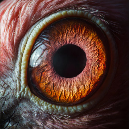 A detailed close-up of a bird's eye reveals the vibrant orange and yellow hues of the iris and the intricate patterns surrounding the pupil. the delicate feathers and minute textures highlight the eye's complex structure and natural beauty.