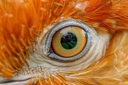 Close-up of bird's eye with vibrant orange and brown plumage. That the image is generated using AI.