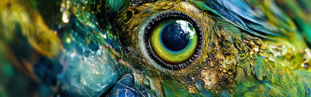Close-up of a chicken's eye with detailed feathers and vivid colors. That the image is generated using AI.