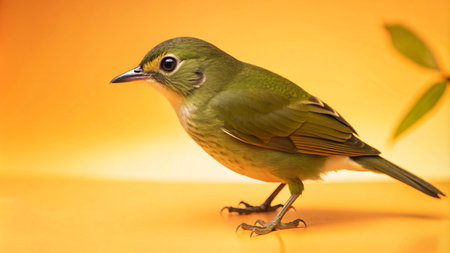 A small green bird with a yellow ring around its eye stands on an orange background.