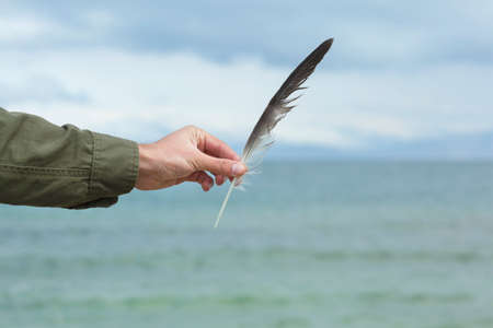 man hand feather on the sea background