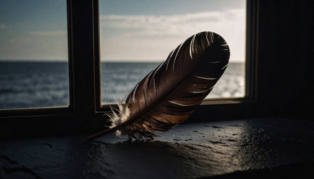 A stunning black feather rests on a textured surface, surrounded by sparkling dust, creating a captivating visual. The soft details emphasize nature's elegance and artistic beauty.