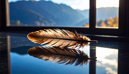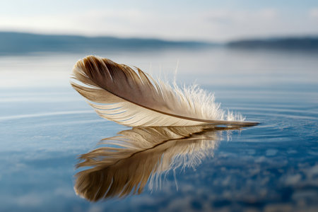 A graceful lone feather floats softly on still water, its reflection crisp beneath, surrounded by a tranquil backdrop bathed in gentle, natural illumination.