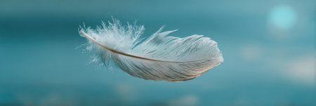 A soft feather gently floats in mid-air, its delicate strands illuminated by soft blue light, creating a calm and peaceful atmosphere.