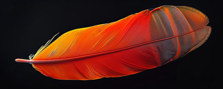 Single vibrant orange feather on black background, artistic close-up. Nature and beauty concept
