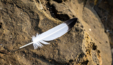 A single black and white bird feather rests gently upon the rough, weathered surface of a stone. This simple, natural scene evokes a sense of tranquility, loss, and the delicate beauty found in natures details. A symbol of flight, freedom, and the quiet moments in the wild.