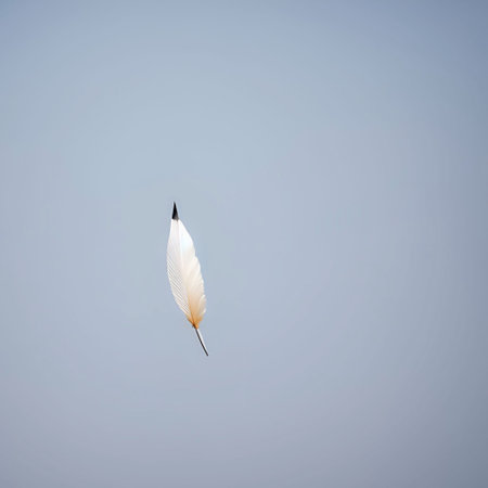 A delicate feather floats gracefully against a clear blue sky, symbolizing freedom and tranquility in nature. The soft texture and minimalism create a serene atmosphere.
