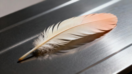 Detailed of a gentle cream and peach colored bird feather, showing its soft structure against the cold, horizontally textured brushed stainless steel surface with dramatic shadows.